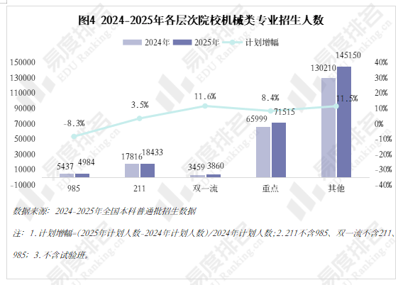 985院校机械类招生人数波动式下降,本年达到五年来最低,较2024年缩减8。3%,其他各条理院校则有3%-12%的涨幅,以更大的体量支持机械类招生总规模的抬升。近年,985院校缩减机械类专业招生规模已是常态,2021-2023年“三连降”,2024年急速回升,本年又起头下滑,华中科技大学、大连理工大学较客岁降幅达28%、23%。虽说机械类专业有所回温,但并非大热专业,尚处于新老专业更替期间,保守专业仍是招生从力,这就导致部门院校正在招生策略调整时将更多比例投放至市场需求度更高的专业,以“机械五虎”之一华中科技大学为例,电子消息类专业则扩招最多。