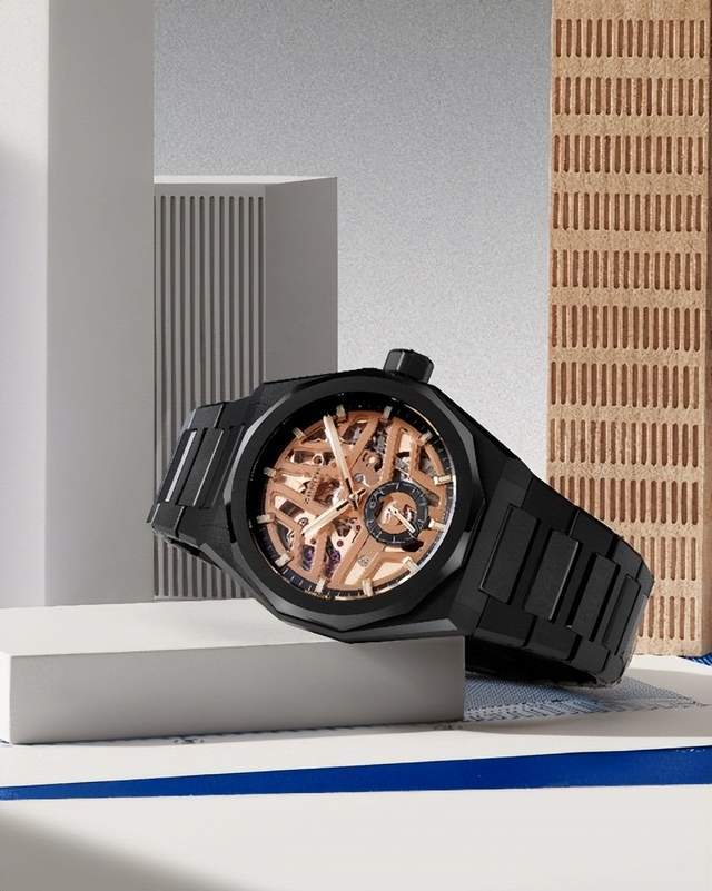 ZENITH实力时DEFY SKYLINE巅峰系列镂空天际手表以镂空布局、锐利几何线条取现代都会的视觉对比结果,将现代手表设想言语推向全新境地。其镂空架构令El Primero 3620 SK型机芯的精妙构制一览无遗,而细密机械运转间的光影交织则取都会天际线的动感韵律相呼应。全新做品以斗胆的黑色陶瓷搭配金色机芯呈现,突显出手表的建建美学特质,亦付与其极具现代感的都会格调。
